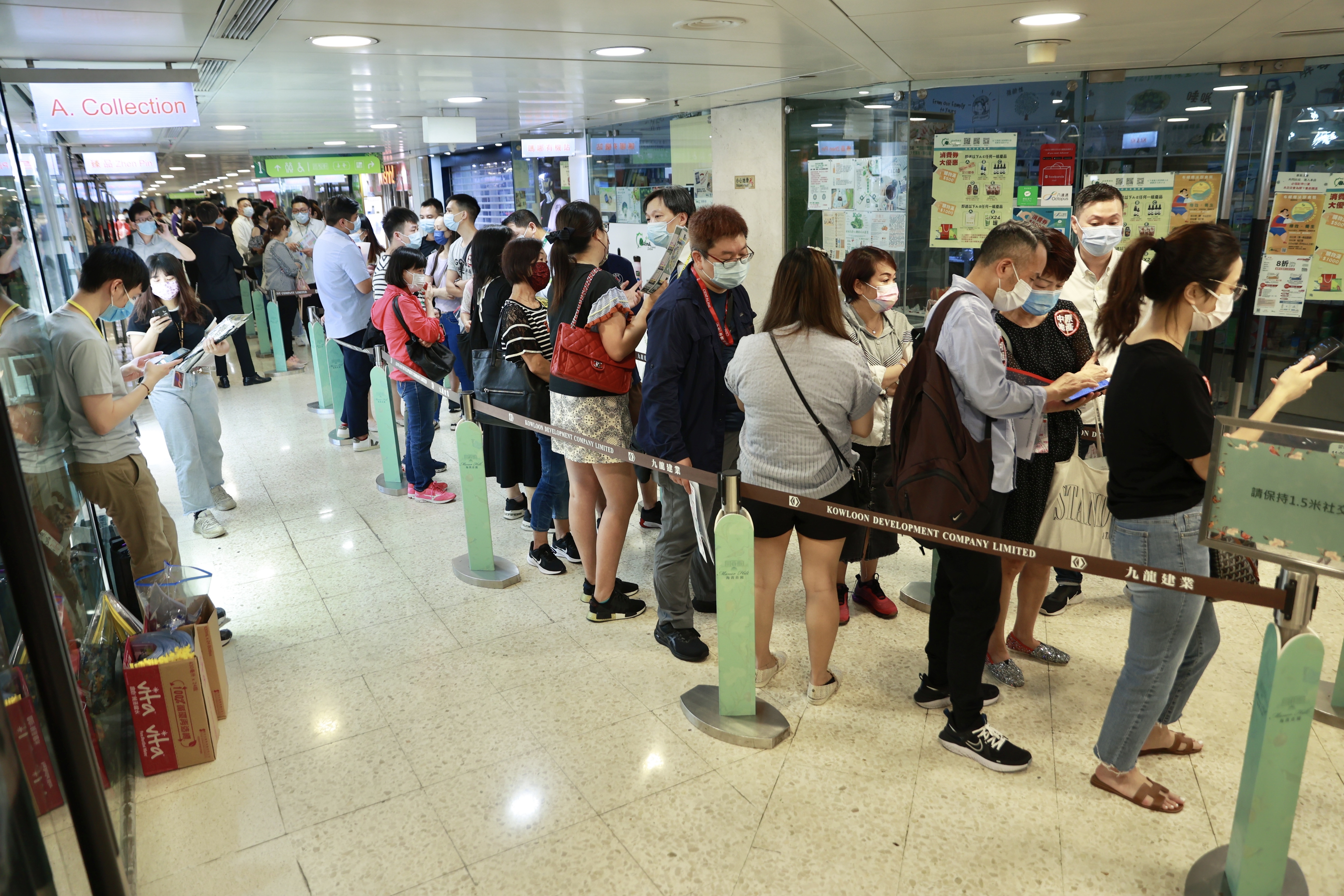 現場所見,早上十時許已經開始有準買家陸續抵達售樓處報到及訓於等候區等候,當中亦不乏家庭客及年輕客。由於等候人數眾多,發展商亦有在等候區設有要求準買家登記健康申報表及保持1.5米社交距離的指示牌。